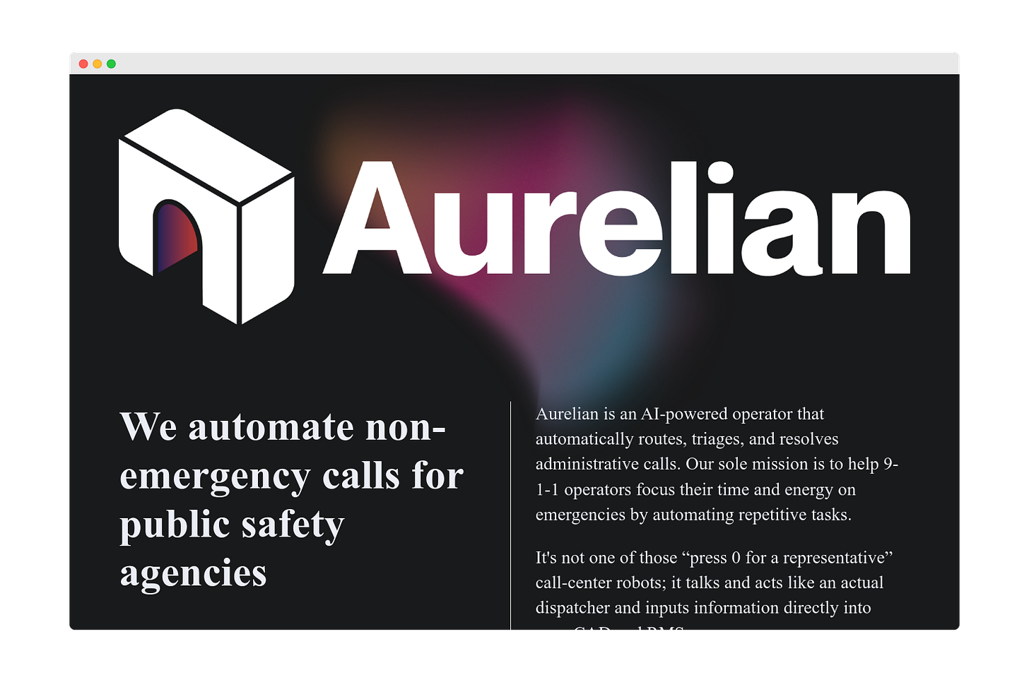 What? - Aurelian automates non-emergency calls for 9-1-1 centers through an AI-powered operator that efficiently routes, triages, and resolves administrative calls without requiring human intervention.