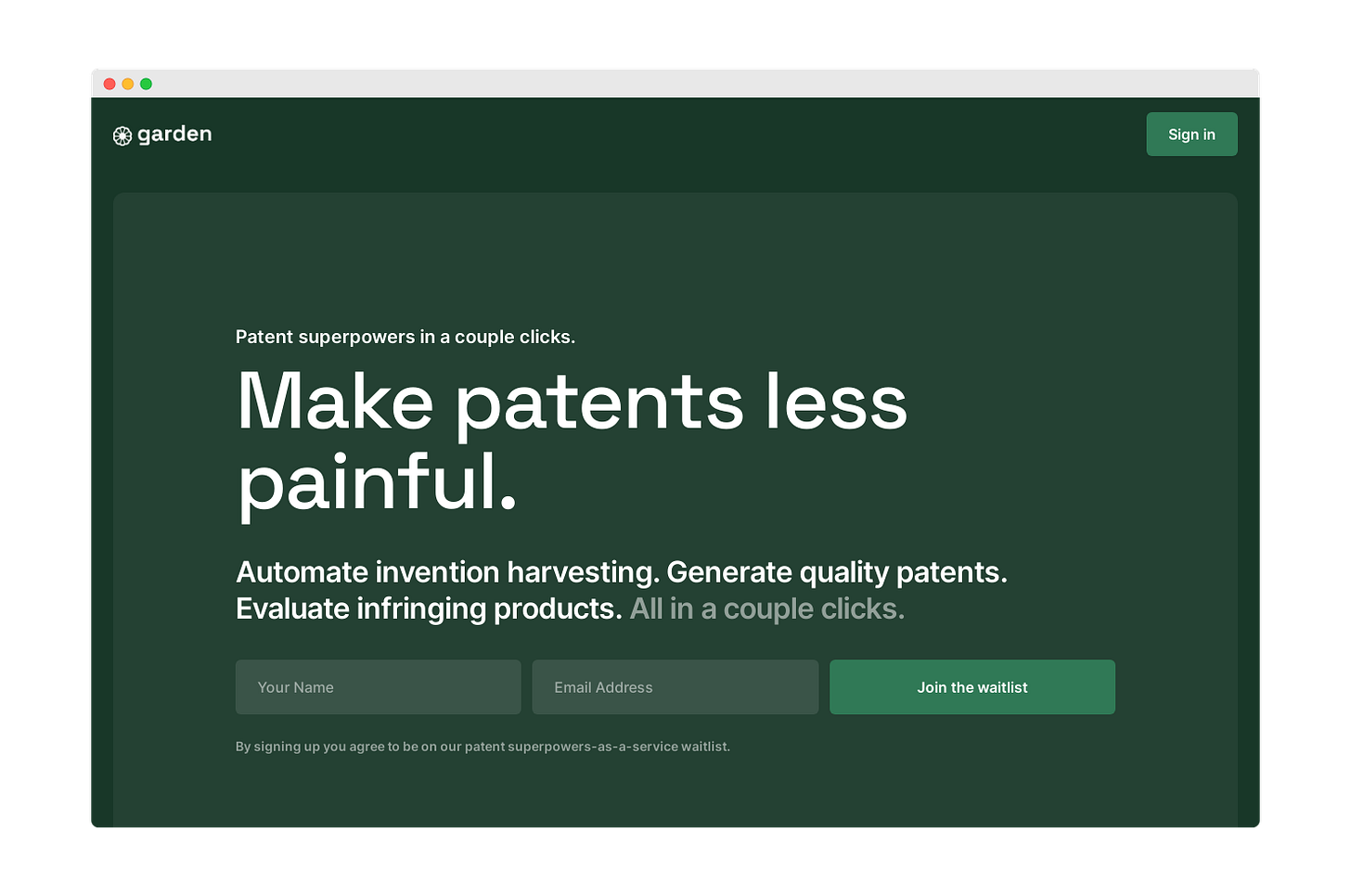 What? - Garden is building AI-powered search and analysis tools to make the patent process less painful and more effective for R&D organizations, inventors, prosecutors, and litigators. Their flagship product, Patentbreaker, is a groundbreaking 102/103 prior art search tool that automates the generation of claims charts for inter-partes reviews.