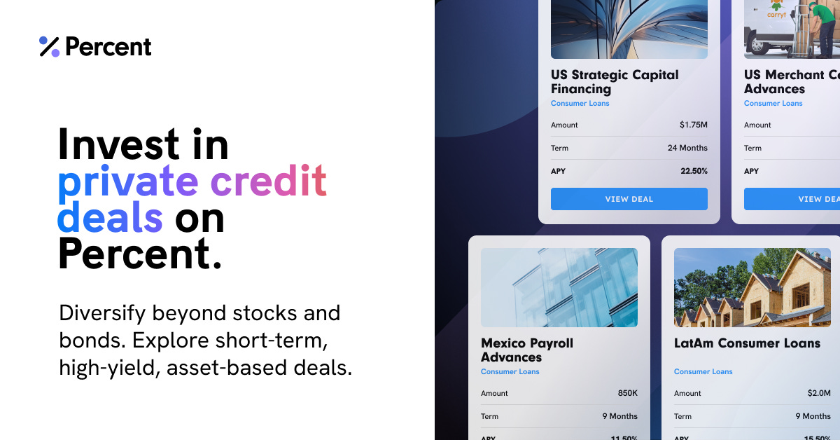 Why? Private credit offers what traditional portfolios increasingly lack: consistent yield potential (Percent's marketplace delivered 14.9% average net returns in 2024), lower correlation to public markets, and shorter investment horizons averaging just 9 months.